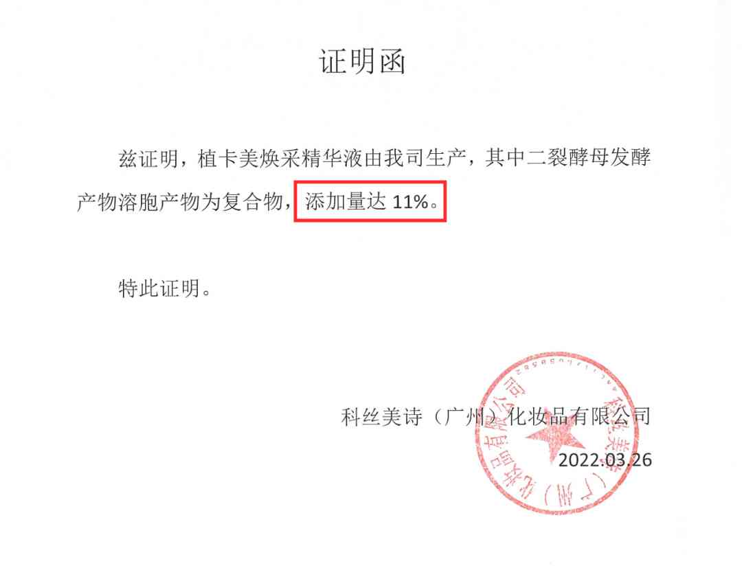 ▲来自一线工厂的证明函而之所以能做到这一点,核心原因有两个。一是因为植卡美的合作工厂,是国际领先的代工厂——科丝美诗(COSMAX),全球有超过145个大牌,都是它们家代工的。和那些大牌同样的代工厂,自然在原料成本方面,就能拿到一些优势。