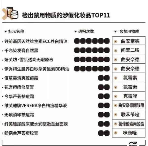 假冒化妆品的危害毋庸赘言,在398批次(涉嫌)假冒化妆品中,有64批次检出禁用物质,其中18批次祛痘类产品,全部含抗生素。例如,标称“佰草慕清爽控痘霜”的假货检出氯霉素和酮康唑,标称“新德金芦荟痘胶膏”的假货检出咪康唑和灰黄霉素……