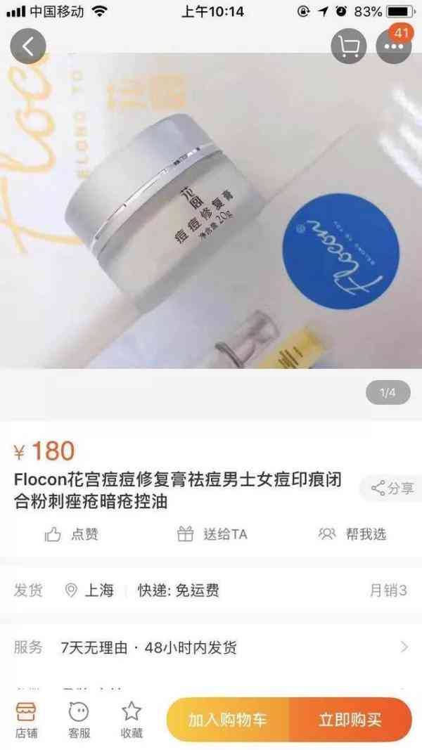 以“花宫痘痘修复膏”为例,前日(19日),淘宝有四个商家在售。四家的客服均确认,这款产品没有外包装,没有生产企业和标准文号等信息。