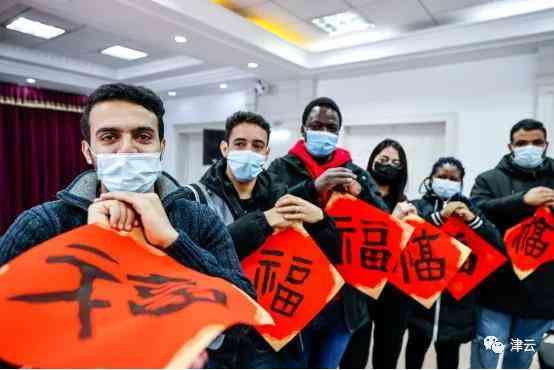 在天津过春节的外国留学生们写下福字,体验中国传统文化