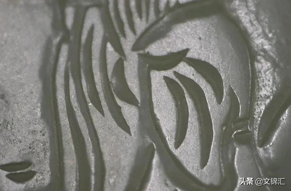 辽金时期阴刻线。古代玉器的阴刻线是一种艺术,下砣犀利流畅灵动自然优美,转砣处气韵相连宽窄变化自如,底部始终呈下尖上宽的V字形。