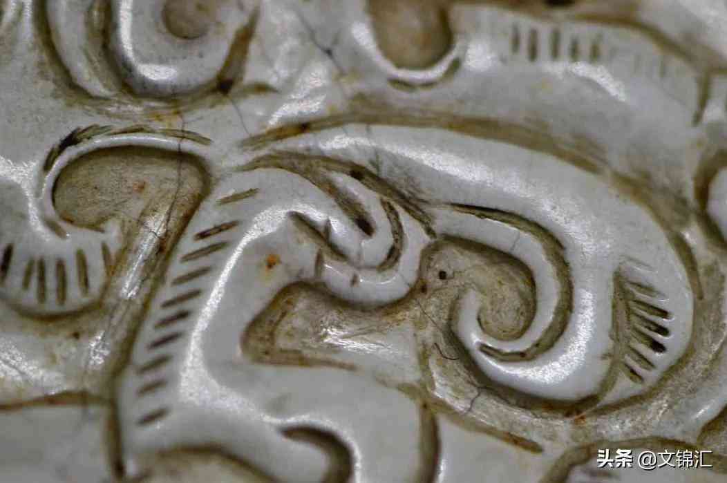 明代玉器细部图。工痕内外皮壳一致沁色漫布,底槽较深线条顺畅,转弯处砣痕接刀紧凑。