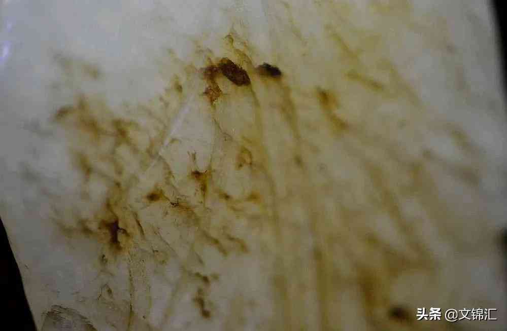 玉器的沁色鉴定也很重要,当然也有没有沁老旧如新的古玉。玉器的沁与土壤中的环境有关,或者常与某种物质接触而形成的如下图: