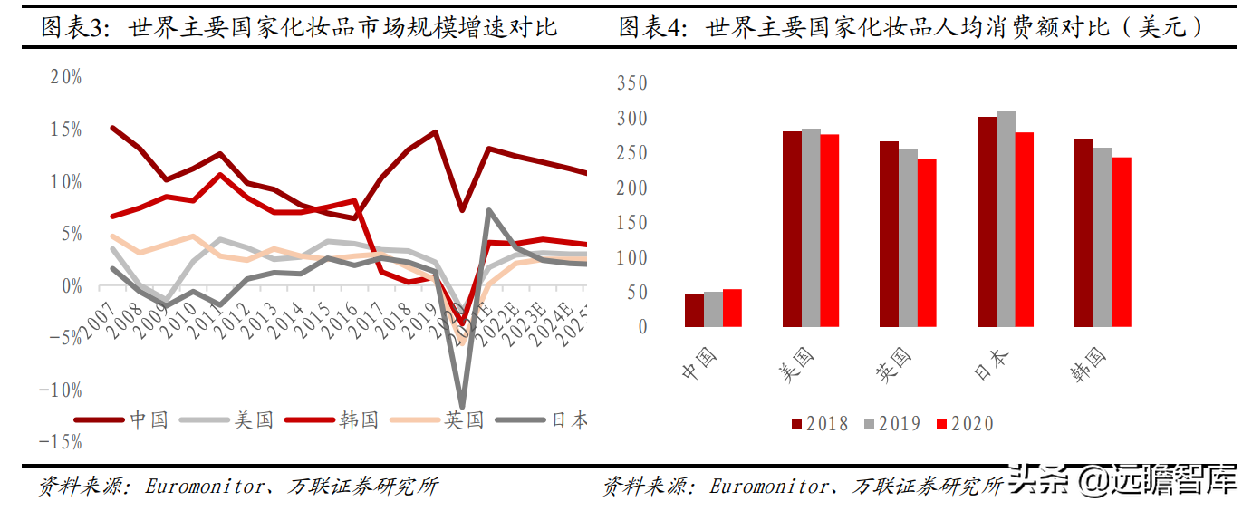 根据Euromonitor的数据显示,2020年中国化妆品人均消费额为53.8美元,而美国/英国/日本/韩国的化妆品人均消费额为240-280美元,若以这些发达国家的化妆品人均消费额作为天花板,则中国化妆品市场仍有5倍的发展空间。
