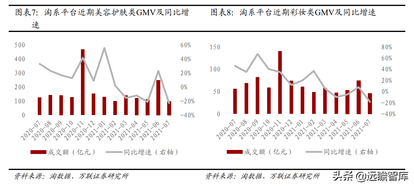 分品类看,淘系平台护肤类在2021上半年的累计GMV同比2.52%,彩妆类同比+7.41%。