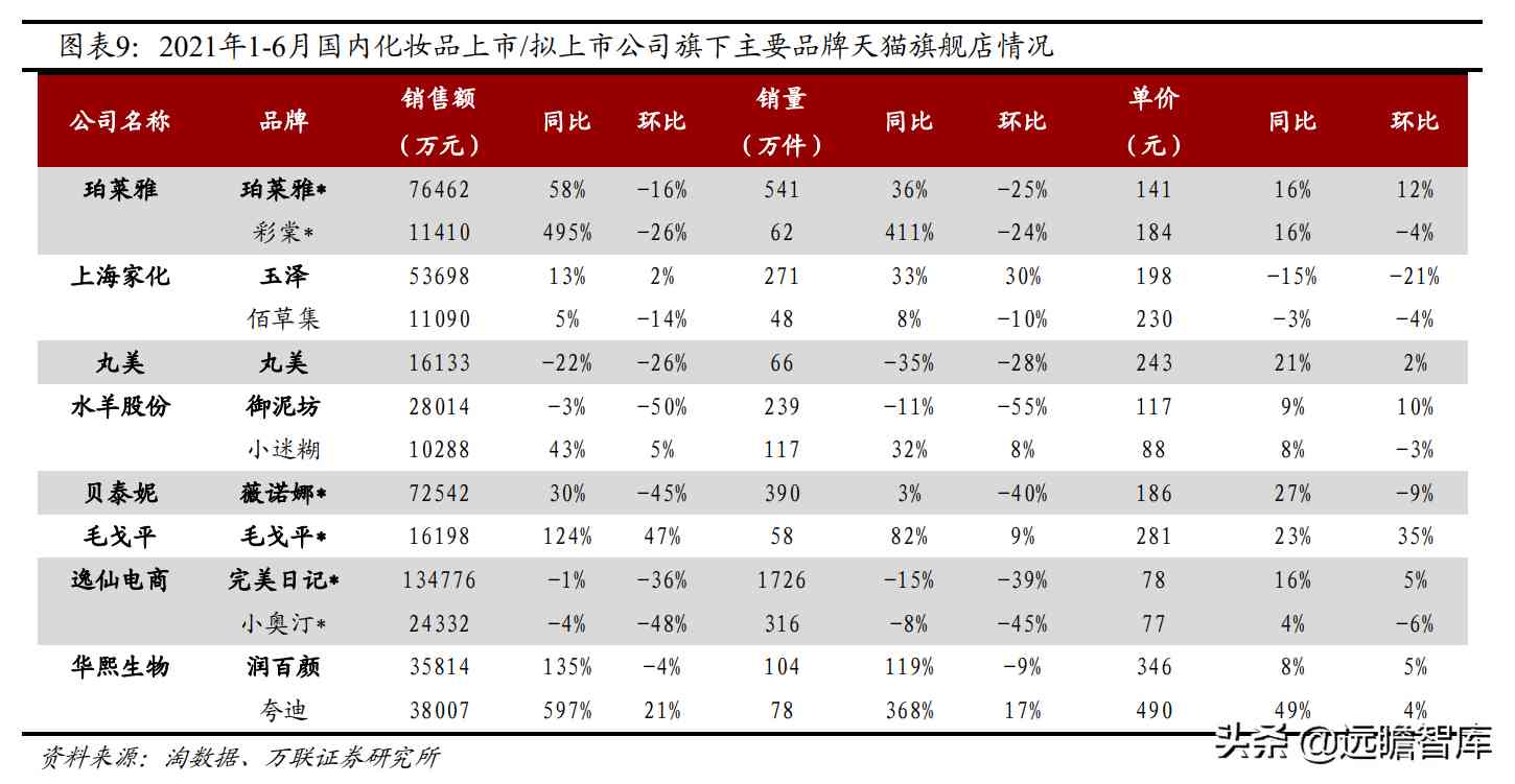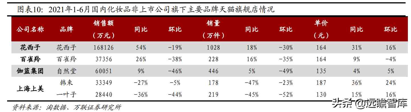 (1)国内品牌:2021年1-6月,上市公司品牌中,珀莱雅旗下珀莱雅/彩棠天猫旗舰店GMV 同比分别+58%/+495%;华熙生物旗下功能性护肤品牌润百颜/夸迪同比分别+135%/+597%;非上市公司主品牌中,花西子表现不俗。