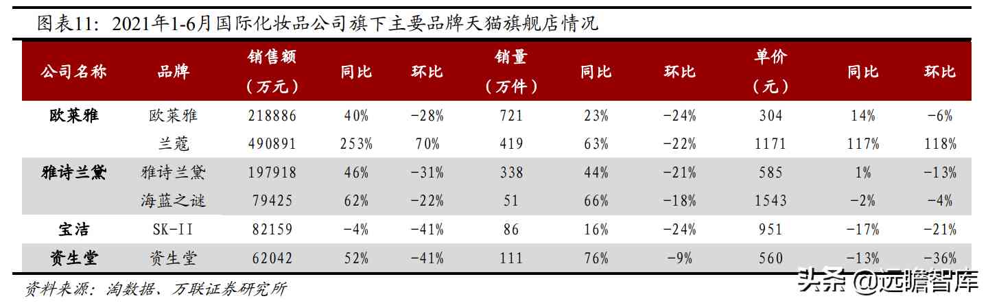 (2)国际品牌:欧莱雅旗下欧莱雅/兰蔻、雅诗兰黛旗下雅诗兰黛/海蓝之谜、资生堂旗下资生堂同比快速增长。