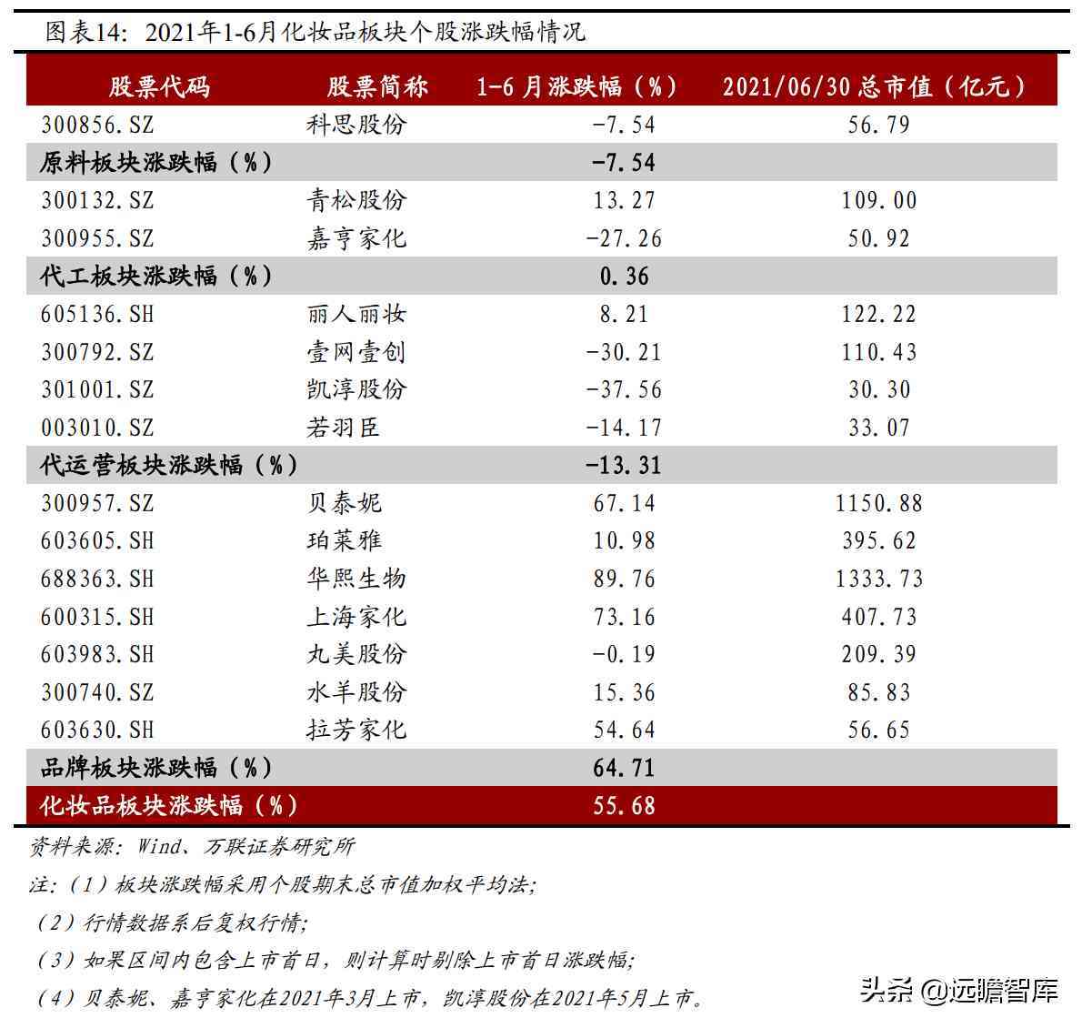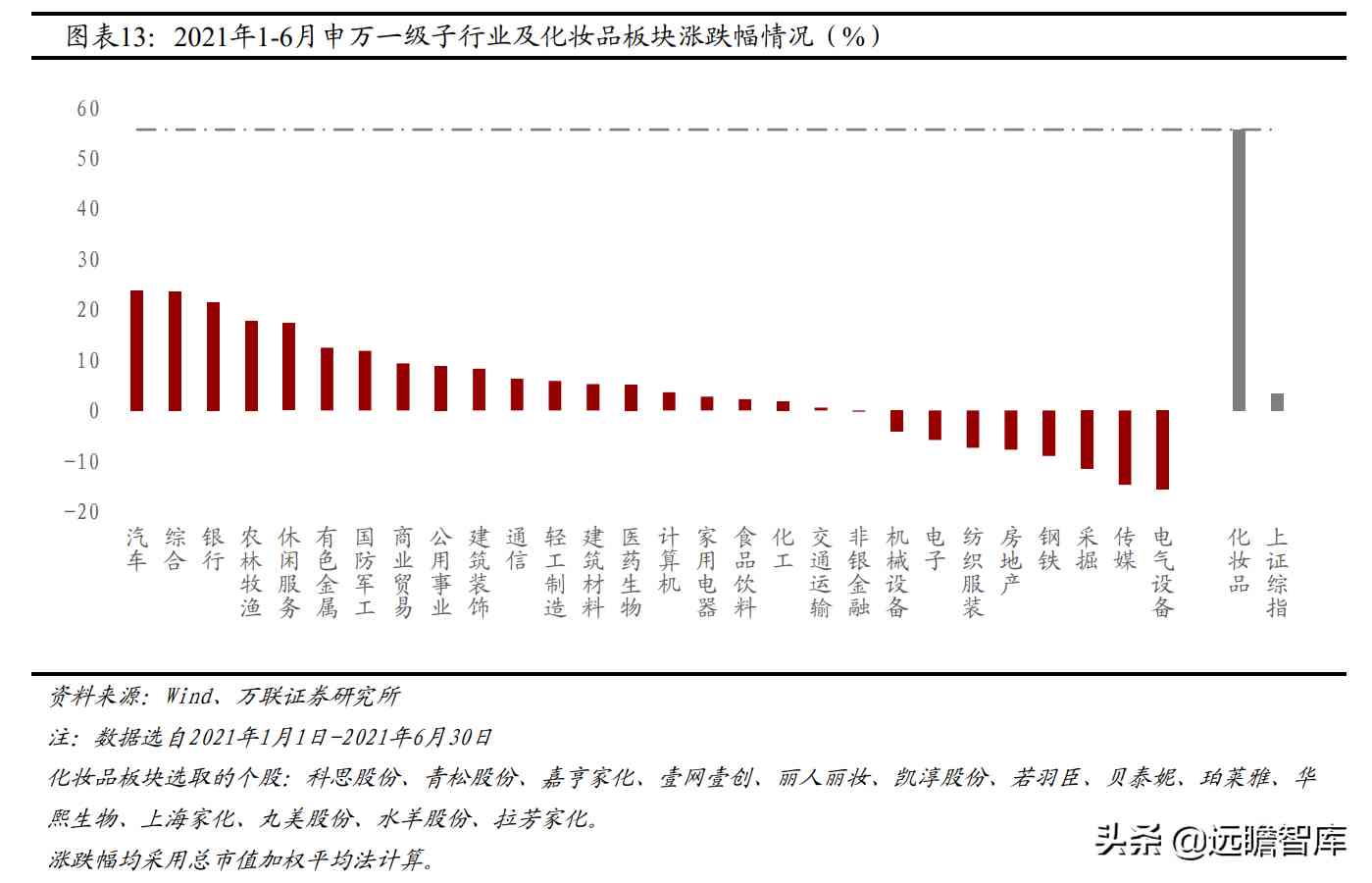 化妆品板块1-6月上涨55.68%,大幅跑赢大盘指数从2021年年初至2021年6月30日,化妆品板块上涨55.68%,对标申万一级行业涨跌幅,化妆品表现超过所有其他板块,包括汽车(+23.83%)、综合(+23.62%)、银行(+21.46%)板块,大幅跑赢上证综指52.28个pct。