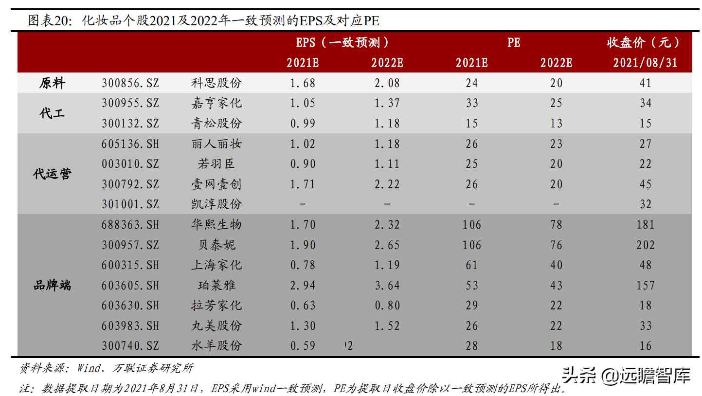 选取2021年8月31日收盘价以及Wind一致预测的2021年EPS计算PE。原料、代工、代运营板块个股的PE值在25倍上下,而品牌端的个股中,华熙生物与贝泰妮的PE领先,均为106倍,紧接着上海家化、珀莱雅的PE在50倍以上,品牌端子板块整体的估值水平较高。