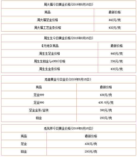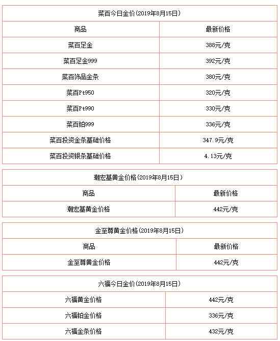 2019年8月15日今日黄金价格今天多少一克查询包括:周生生/周大福/六福珠宝/老庙黄金/老凤祥/菜百/太阳金店/潮宏基/金至尊等品牌999足金价格查询。