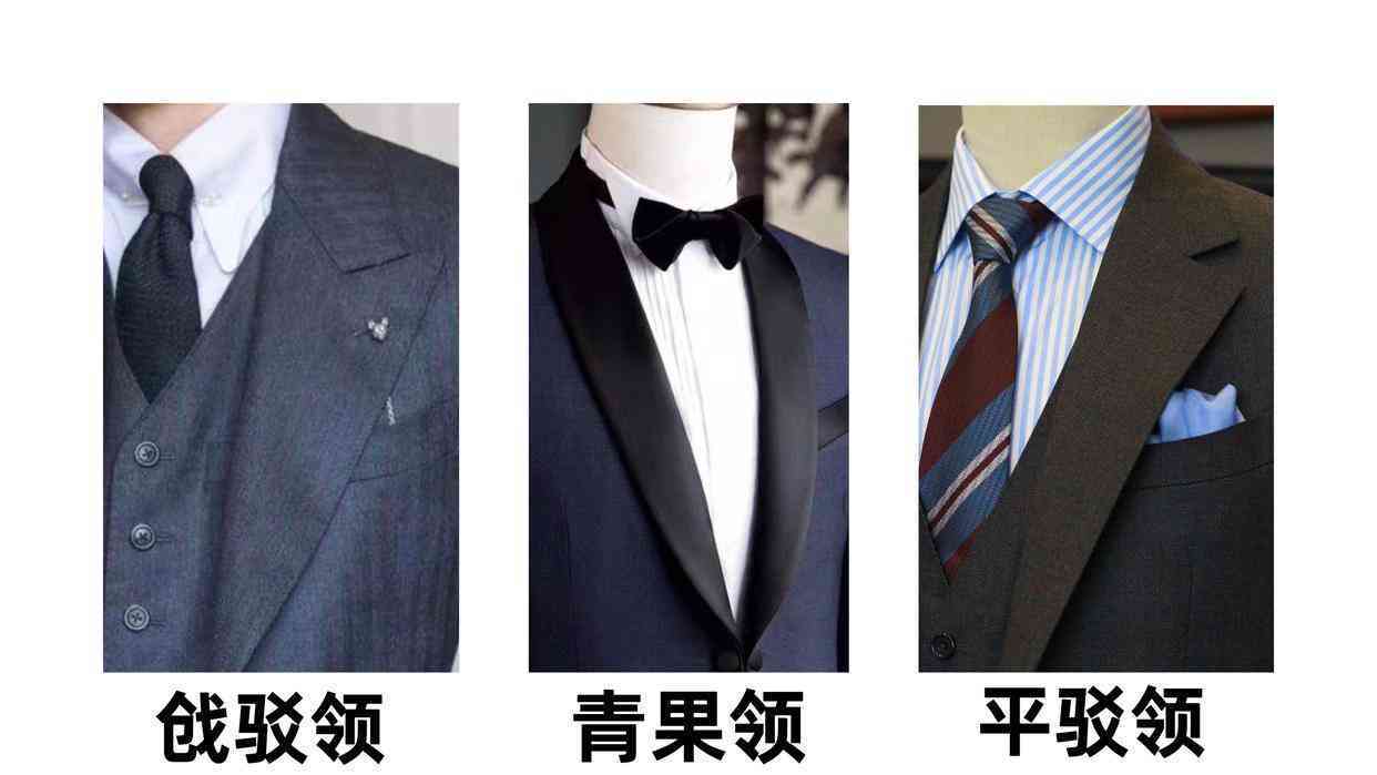 西装领型:平驳领、戗驳领、青果领(礼服款用得较多)