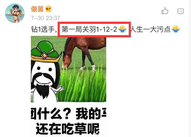 最后一楼玩家:钻一的选手,局关羽1-12-2,人生的一大污点!喂喂喂你们团什么呢?没看见我的马还在吃草呢?哈哈哈,最后流到你们了,你们经历过最差的战绩是什么呢?如实招来!