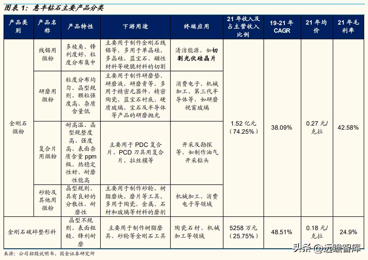 公司主要产品包括金刚石微粉和金刚石破碎整形料两大系列,金刚石微粉根据下游用途可进一步分为线锯用微粉、研磨用微粉、复合片用微粉、砂轮及其他用微粉。