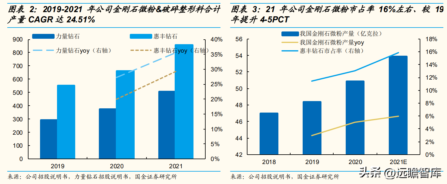 公司2019-2021年金刚石微粉&破碎整形料合计产量分别为5.52/6.63/8.56亿克拉、CAGR达24.51%,增速超越行业,市占率持续提升、至21年16%左右(按产量),相较于19年提升4-5PCT。