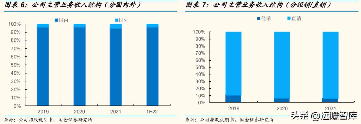 直销/国内为主,经销为辅,直销收入占比逐年提升。2019-2021年公司直销收入占主营业务的比例分别为89.17%、92.79%、93.53%,呈逐年提升态势。