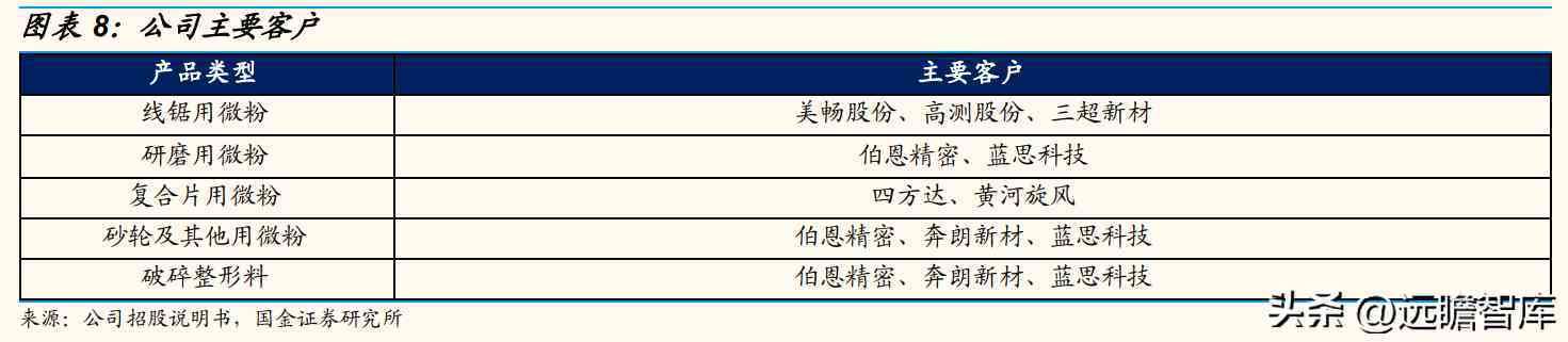 复合片用微粉主要客户为国内复合片龙头企业四方达。砂轮及其他用微粉客户包括国内陶瓷石材用金刚石工具龙头企业奔朗新材。