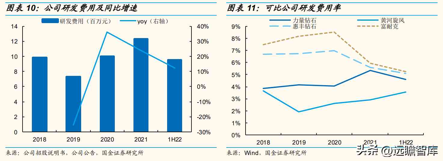 公司拥有金刚石破碎整形、提纯、自动分选、泡沫化金刚石微粉制备工艺及纳米金刚石制备工艺等主要核心技术。同时,建设郑州技术中心,加强与科研院校的产学研深入合作,扩展金刚石微粉功能性应用领域,并开展功能化金刚石新产品研究,加强技术方面储备。2018-1H22年公司研发费用率在5.5%-7%区间,高于同业可比公司平均值。