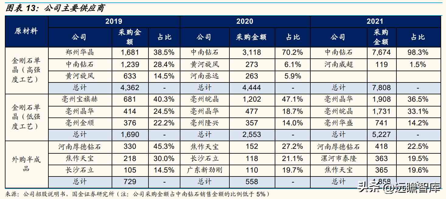 公司主要原材料包括金刚石单晶(高强度/低强度工艺)、外购半成品。其中,低强度工艺主要向亳州市金刚石单晶生产商采购,高强度工艺金刚石单晶主要自中南钻石(工业金刚石产量市占率30%+)采购,19-21年公司自中南钻石采购高强度工艺金刚石单晶的金额由1238.61万元增长至7674.35万元、占公司高强度工艺金刚石单晶采购总额的比例由28.4%提升至98.3%。