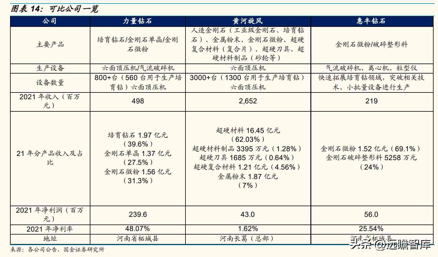 公司主营金刚石微粉/破碎整形料,可比公司为金刚石微粉生产商力量钻石、黄河旋风。力量钻石主营培育钻石/金刚石单晶/金刚石微粉,黄河旋风覆盖人造金刚石全产业链(培育钻石/金刚石单晶/金刚石微粉/超硬复合材料)。