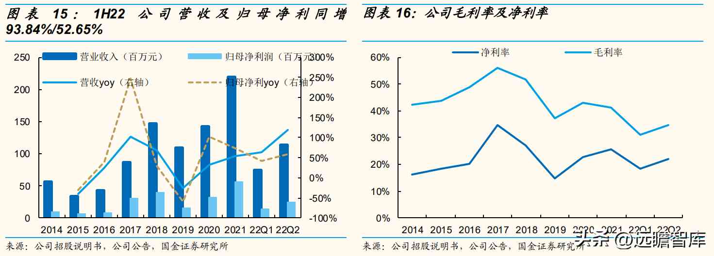 22年行业景气延续,1Q22/2Q22公司营收同增63.72%/120.36%、归母净利同增43%/58.51%,净利增速低于收入增速主要系毛利相对较低的低强度产品收入占比提升拉低综合毛利率。公司预告3Q22归母净利1936-2536万元、同增52.7%-100%,下游持续景气+产能及生产效率提高,驱动业绩继续靓丽增长。
