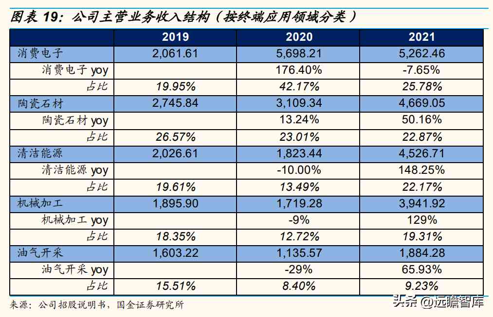分终端应用领域看,公司产品主要应用在消费电子、陶瓷石材、清洁能源、机械加工等领域,21年公司主营产品(金刚石微粉&破碎整形料)应用领域比重分别为消费电子25.78%、陶瓷石材22.87%、清洁能源(光伏)22.17%、机械加工19.31%、油气开采9.23%。