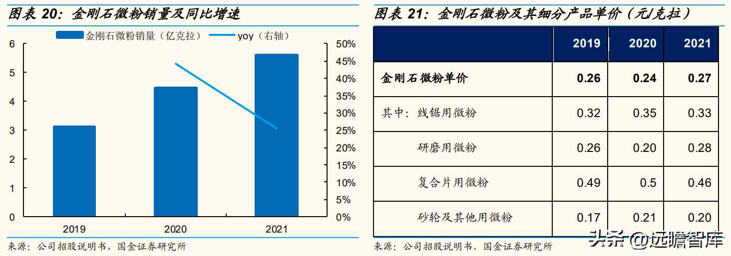 2019-2021年,公司金刚石微粉收入由0.79亿元增长至1.52亿元、CAGR为38.09%,拆分量价看,销量由3.1亿克拉增长至5.6亿克拉、CAGR为34.47%,销售单价分别为0.26元/克拉、0.24元/克拉(-6.4%)、0.27元/克拉(+12.7%)。