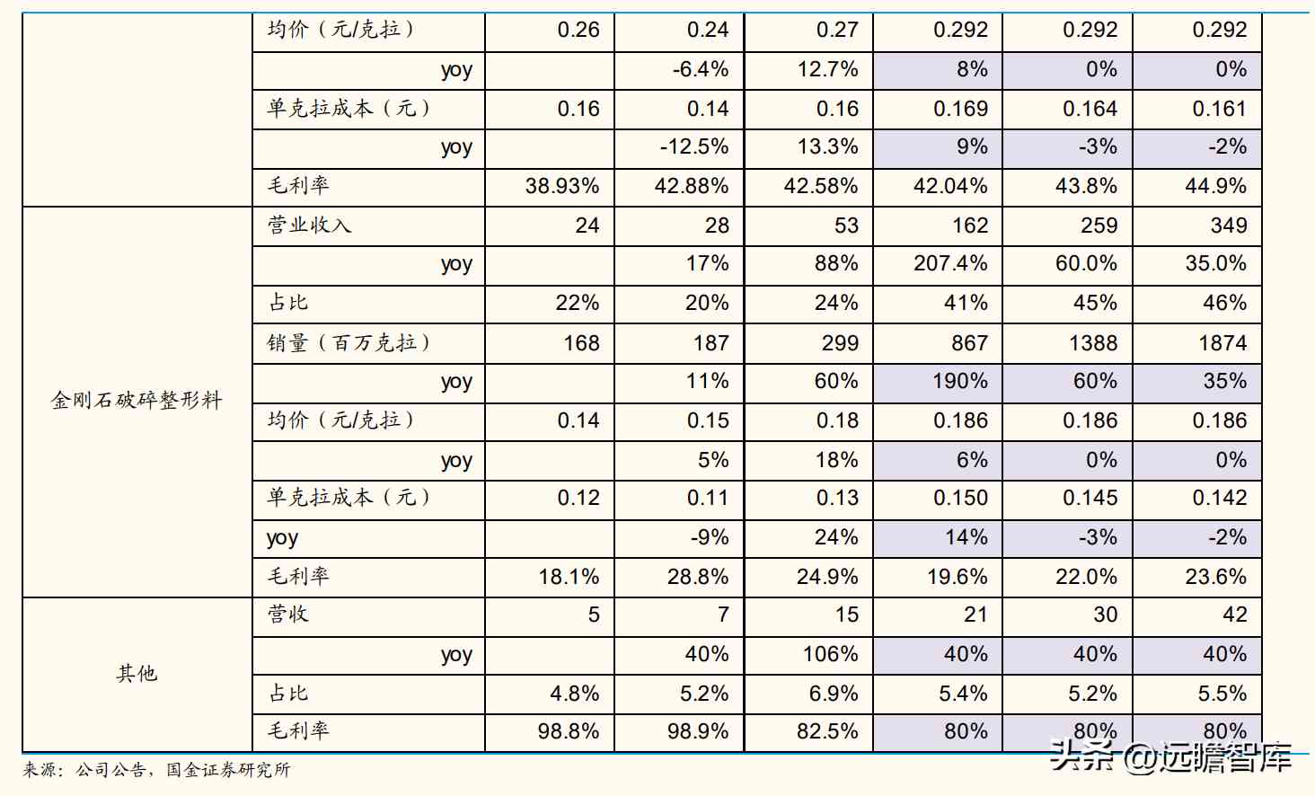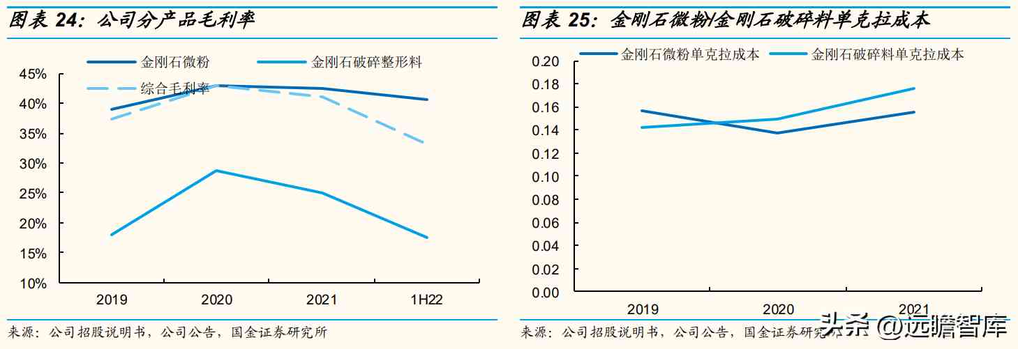 金刚石破碎整形料:受1H22原材料金刚石单晶总体供应偏紧张、价格呈上涨趋势,低毛利的低强度工艺金刚石破碎整形料收入占比提升影响,预计22年金刚石破碎整形料毛利率下降至19.6%,23-24年随着金刚石单晶成本压力有所缓解、毛利率逐步恢复,预计小幅上升至22%/23.6%。