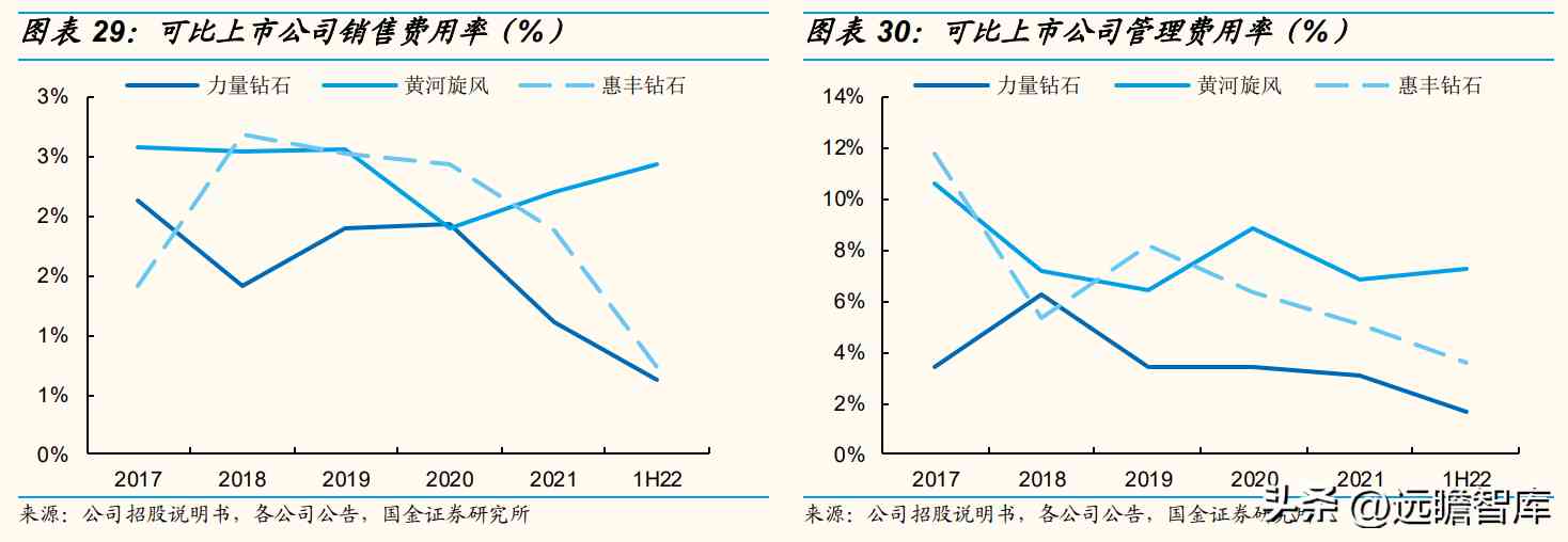 19-21年期间费用率由20.68%下降至13.89%,其中管理费用率由14.9%下降至10.73%,销售费用率由2.52%下降至1.88%,1H22期间费用率9.67%、同比-7.25PCT。对比可比上市公司,管理费用率低于黄河旋风、高于力量钻石。