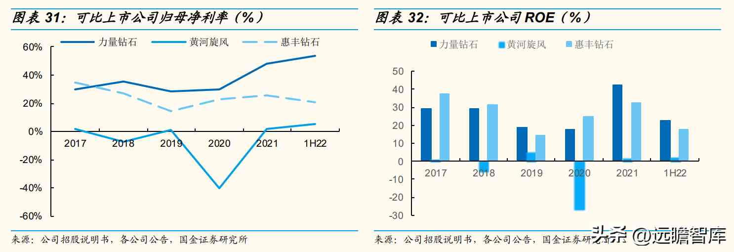 21年公司归母净利率25.54%,高于黄河旋风(1.62%),低于力量钻石(48.07%);公司21年ROE为32.49%、较20年提升7.5PCT,高于黄河旋风(1.33%),低于力量钻石(42.41%)。