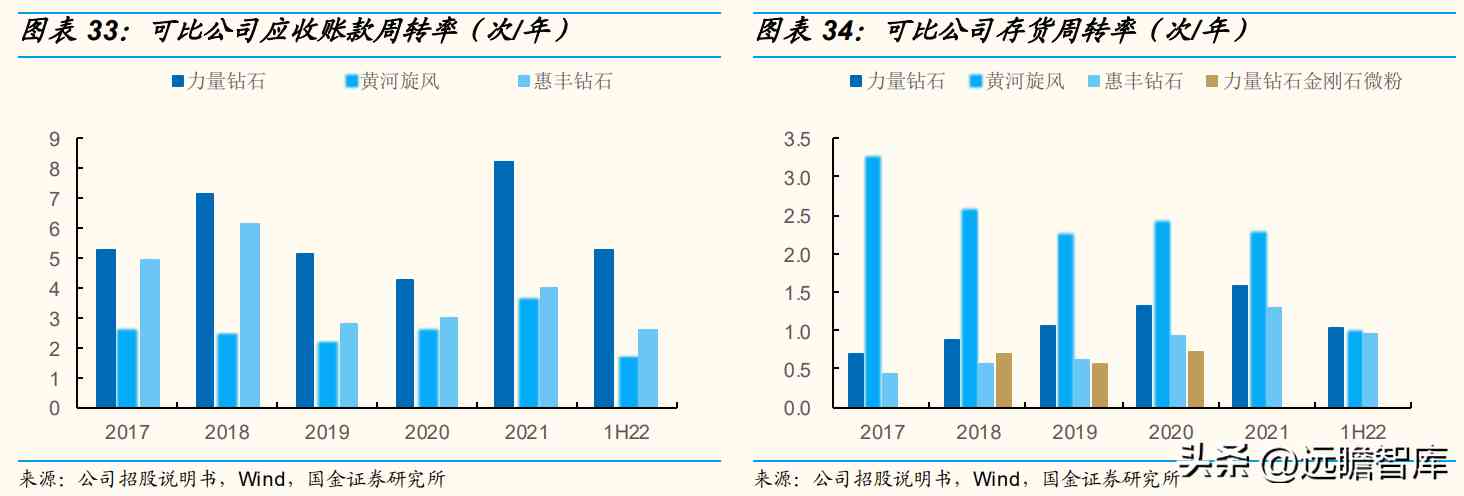 对比同业,公司应收账款周转率低于力量钻石,与黄河旋风相近;公司存货周转率低于同业可比公司平均水平,主要系各公司业务结构及存货构成不同,但公司存货周转率与力量钻石金刚石微粉周转率差异不大。