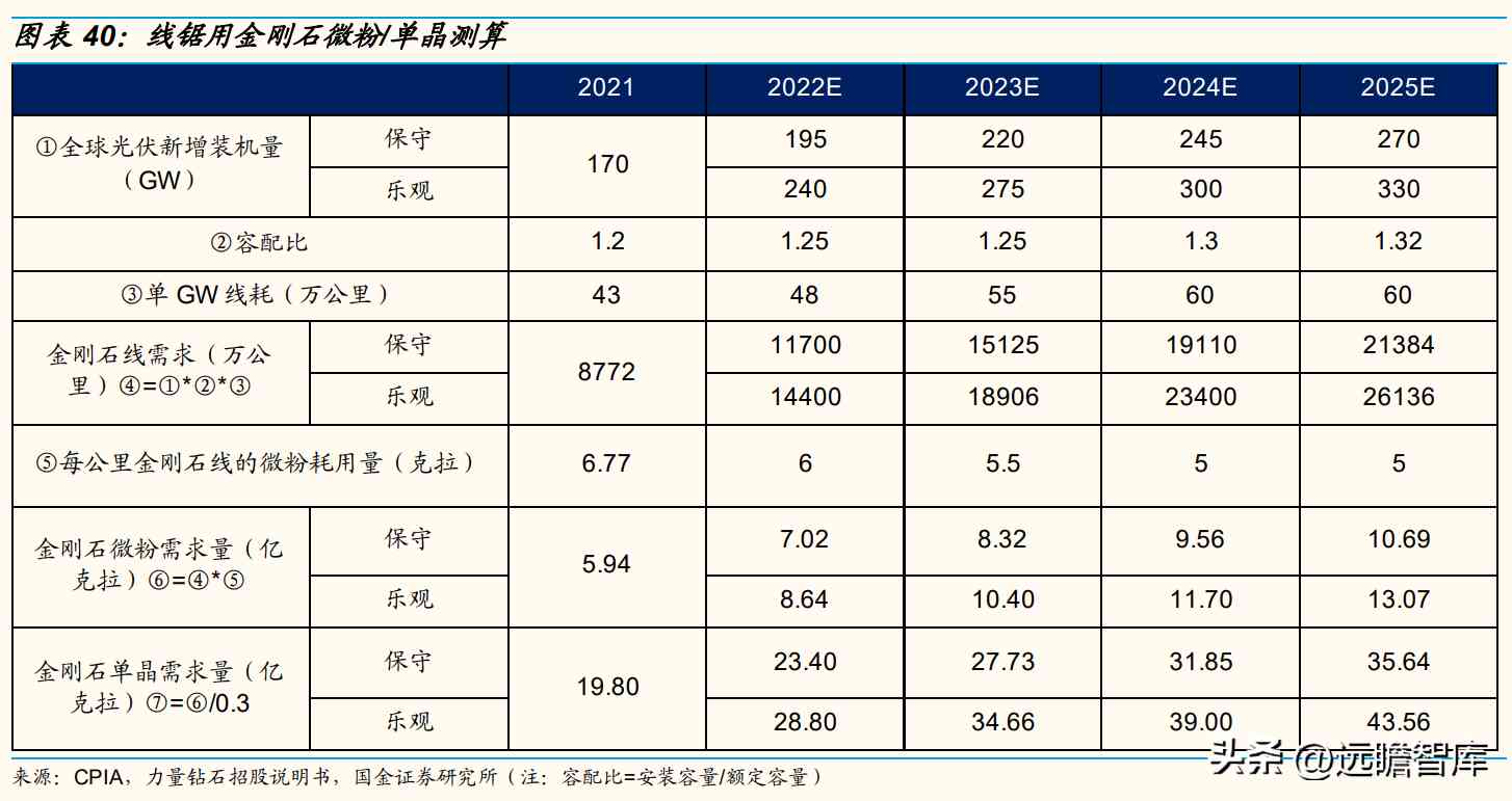 乐观假设下,我们预计2022-2025年光伏晶硅切割用金刚石线需求分别为1.44/1.89/2.34/2.61亿公里、CAGR达31%;2022-2025年线锯用金刚石微粉需求量由8.64亿克拉增长至13.07亿克拉、金刚石单晶需求量由28.8亿克拉增长至43.56亿克拉,21-25年CAGR达22%。