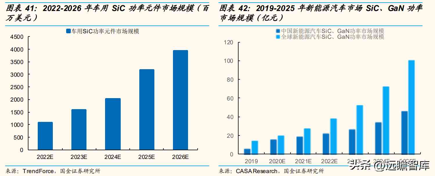 根据CASA Research数据,预计2020-2025年国内SiC、GaN汽车市场规模将由15.8亿元增长至45.9亿元、对应CAGR为23.77%,全球SiC、GaN新能源汽车市场规模将由20亿元增长至100.2亿元、对应CAGR为38.03%。