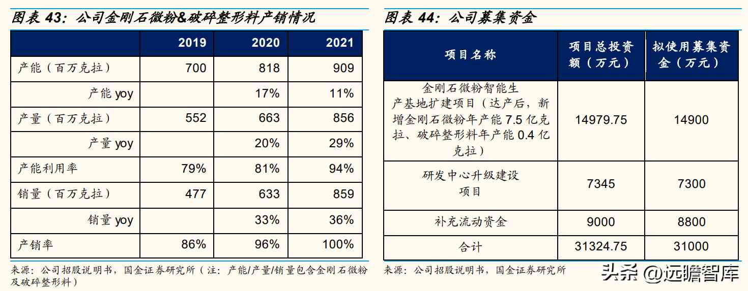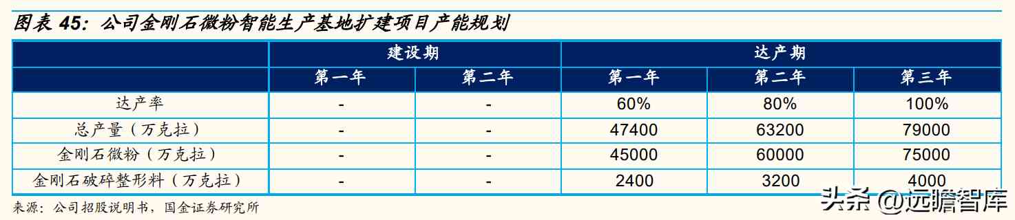 金刚石微粉智能生产基地扩建项目建成达产后,预计每年可新增金刚石微粉产能7.5亿克拉,新增金刚石破碎整形料产能0.4亿克拉,合计7.9亿克拉,相较于21年产能(9.09亿克拉)提升87%。