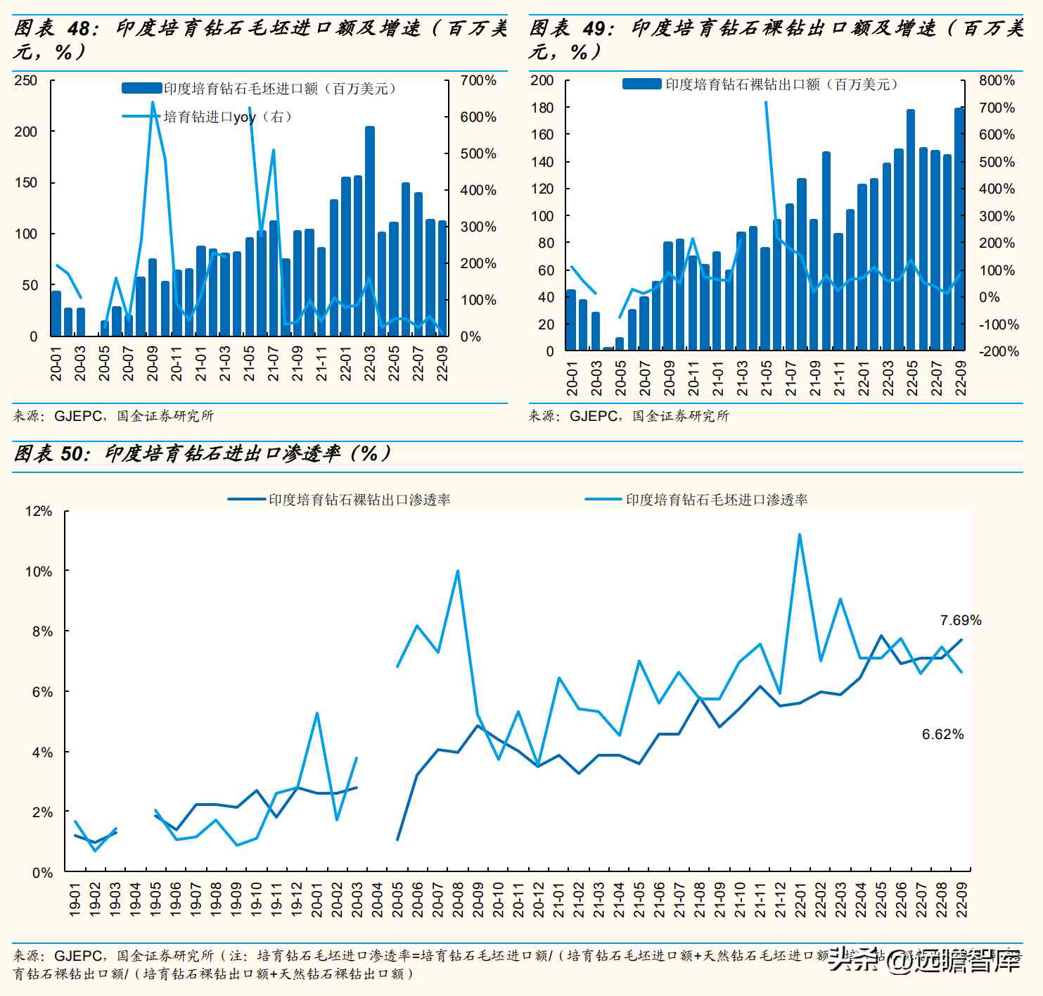 首饰领域,培育钻石下游需求于2019年打开,21年以来,印度培育钻石毛坯进口、裸钻出口金额获益渗透率提升、下游终端复苏,呈现提速增长态势,22年1-9月印度培育钻毛坯进口/裸钻出口12.31/13.29亿美元、分别同比+52%/+64.4%,渗透率分别为7.71%(同比+1.93PCT)/6.72%(+2.47PCT)、提升趋势不变。