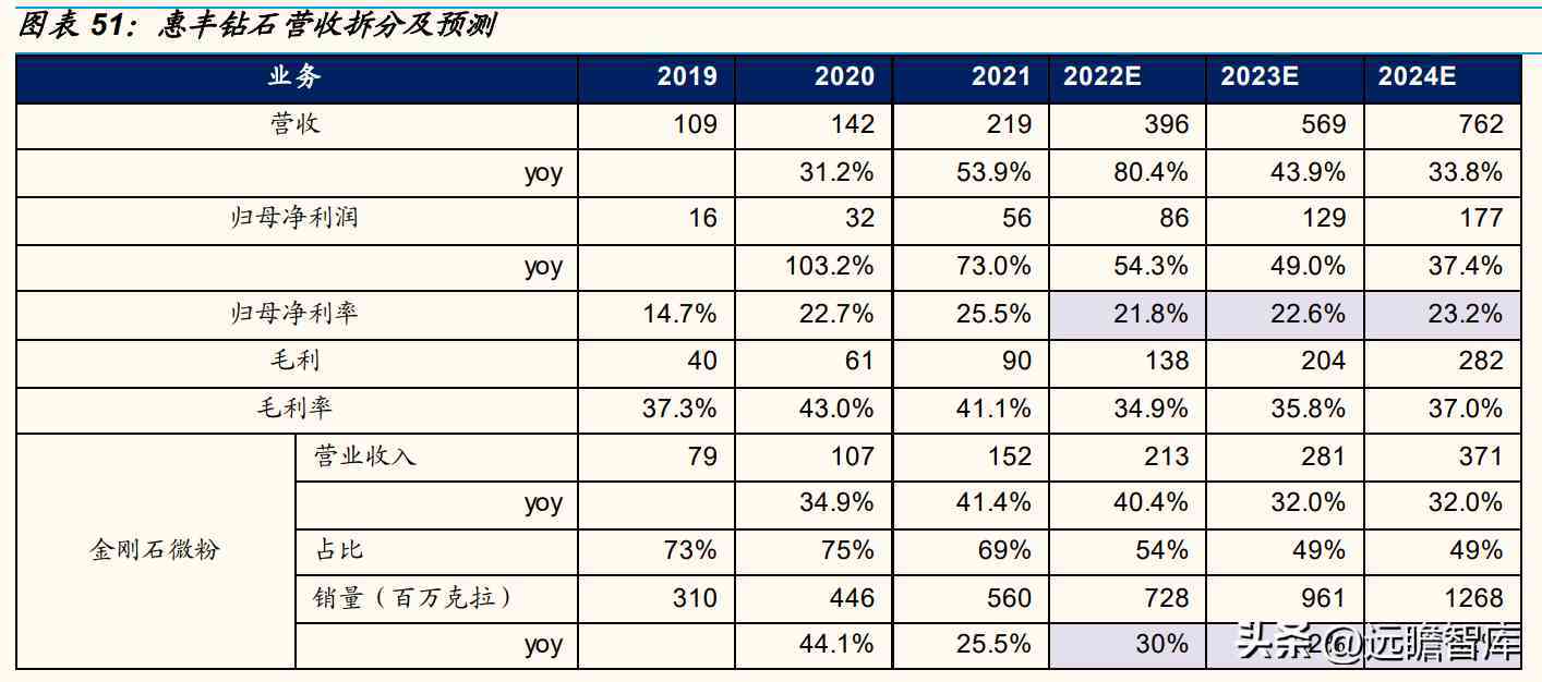 金刚石破碎整形料:19-21年,金刚石破碎整形料量价齐升,考虑下游陶瓷石材等市场需求依旧旺盛,1H22金刚石破碎整形料营收同增297%,假设22-24年销量同增190%/60%/35%,销售单价0.186/0.186/0.186元/克拉、同增6%/0%/0%。综上,预计22-24年金刚石破碎料业务营收1.62/2.59/3.49亿元,分别同增207.4%/60%/35%。