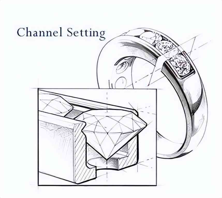 现在流行的卡镶、V字夹镶都属于这一种类,简单来讲就是在两边金属各开个浅槽,将钻石的腰部卡进去。钻石的裸露比爪镶更进步,所以更利于闪烁炯炯的光辉。