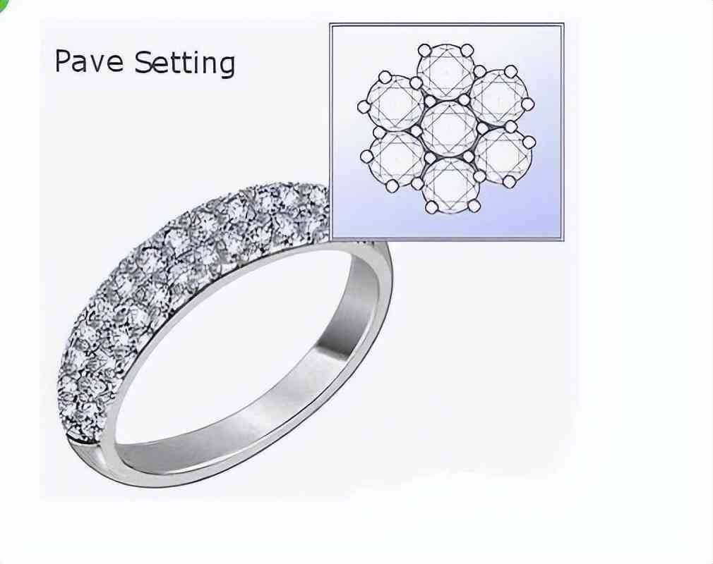 密镶法至少需要7颗宝石。这种镶嵌方法通常让小颗粒或非常小颗粒钻石呈现非常闪烁的效果。