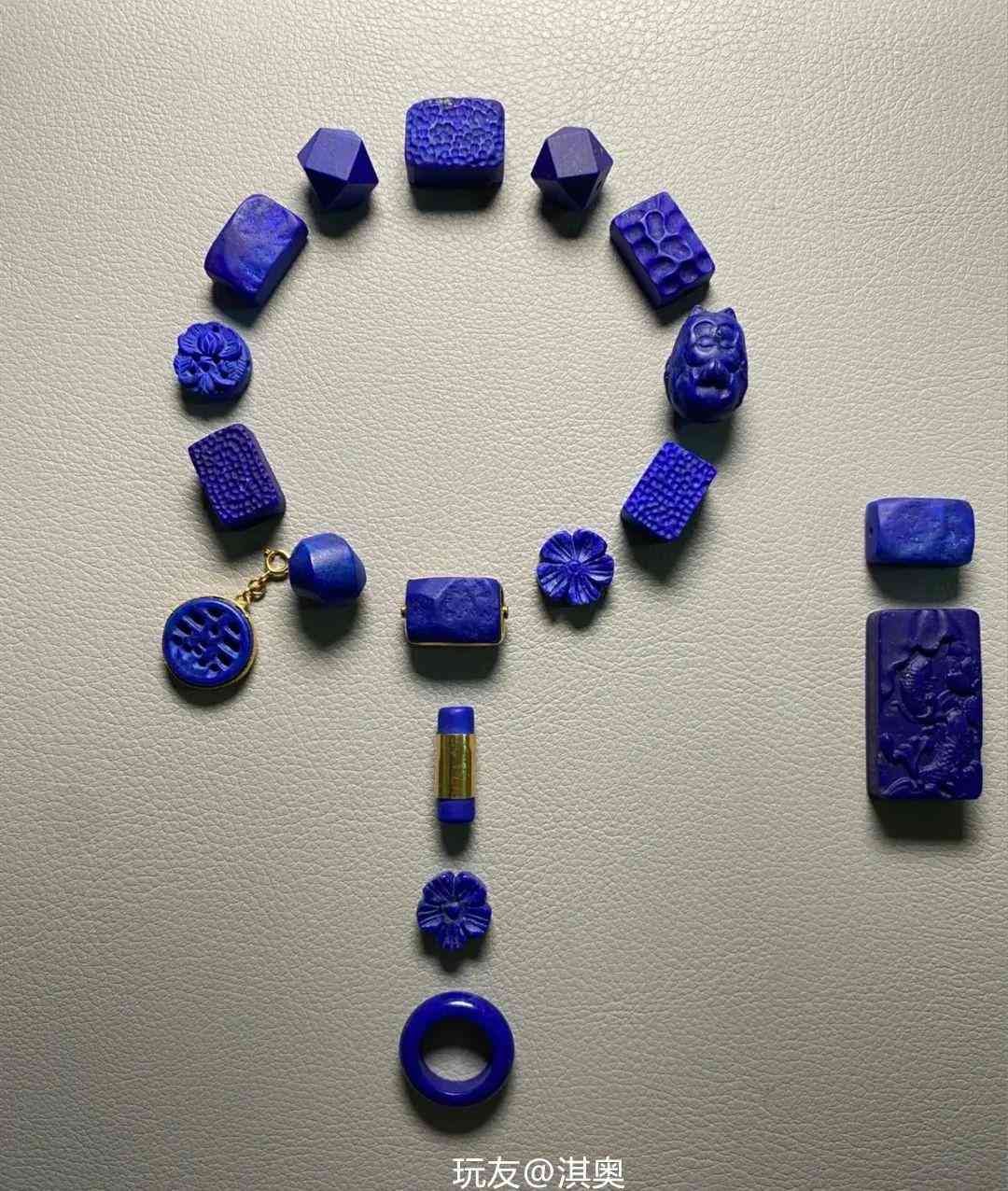 优质的青金石有着均匀的深蓝至天蓝色,极细粒的隐晶结构中夹杂微量的黄铁矿,使其在阳光照射之下溢彩生辉。因“其色如天”,又称“帝青色”,自带一种高贵的气质,早些年青金石也曾作为手串火爆过,不过现在更多是作为配珠出现。