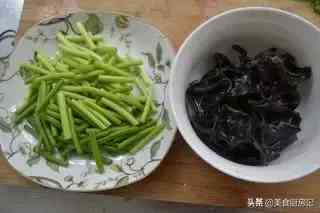 3、配菜,蒜薹和木耳改刀。