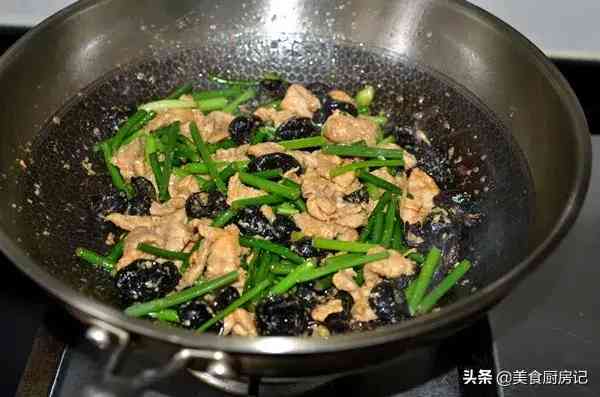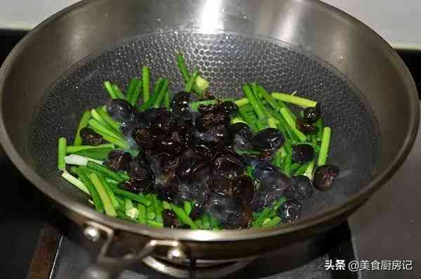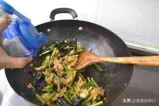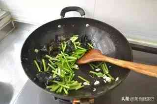 8、倒入蒜薹和木耳翻炒。