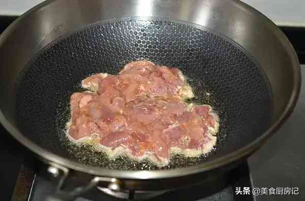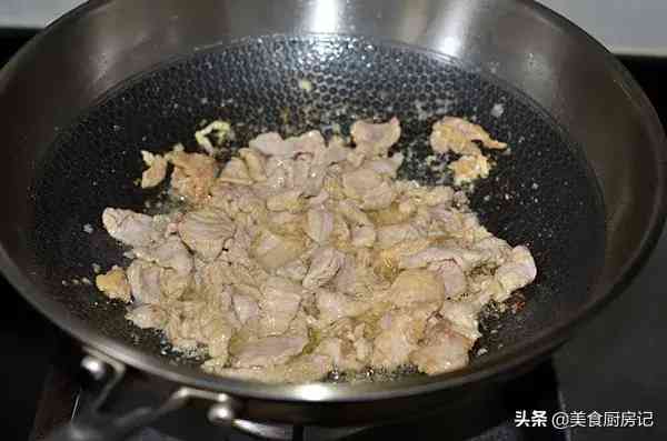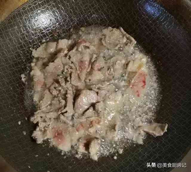 6、炒锅烧热倒油,油温5成热时将肉片放入。