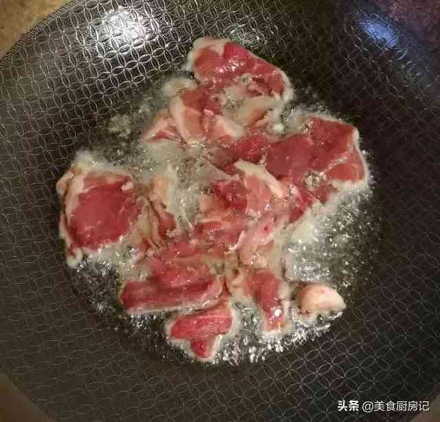 2、油一定多点,肉全部变白后,捞出备用。