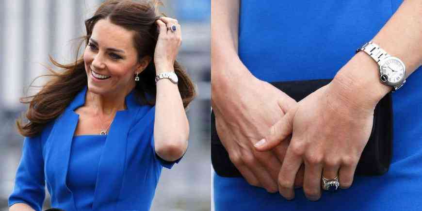 虽然这只Cartier腕表并不是戴安娜王妃的遗物,但价值同样珍贵。这只手表属于Ballon Bleu de Cartier系列,镶嵌了凸圆型蓝宝石,于订婚钻戒上的宝石相称,是威廉王子Prince William送给凯特王妃Kate Middleton的结婚三周年礼物。