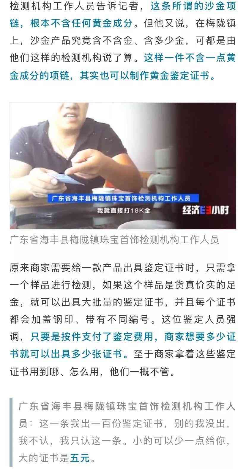 随后记者来到一家名为“金泰盛”的首饰厂,工厂的工作人员直言不讳地告诉了记者行业里一个公开的秘密。