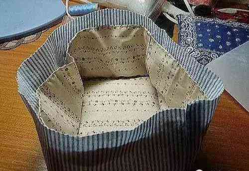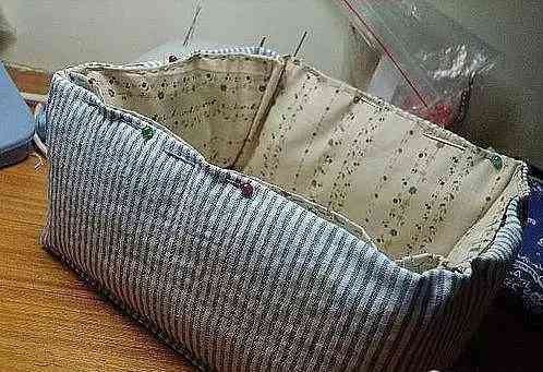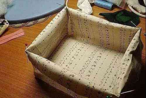 12:将内衬和外圈布用针固定到一起,其中放置硬塑料垫板和辅棉,辅棉薄厚自己酌情放置。然后沿周圈缝合,盒身就基本成型了 。