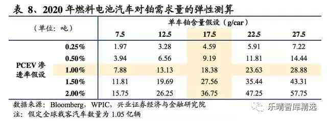 据估计,2017年全球燃料电池催化剂铂金的消耗量不到1.2吨,若假设2020年全球燃料电池汽车渗透率可达1%(假定全球载客汽车数量为1.05亿辆),单车铂含量17.5g,则需消耗铂18.38吨,占2017年全年铂需求量的7.4%,对铂需求带来显著的边际增量。