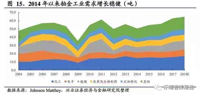 鉴于铂金特殊的物理特性,铂金在汽车以外的传统工业领域用途广泛。从WPIC统计的数据来看,铂金的工业需求可细分为五大领域:化工(31%-36%)、医药(13%-15%)、电子(10%-13%)、玻璃(10%-12%)、石油(6%-12%)。