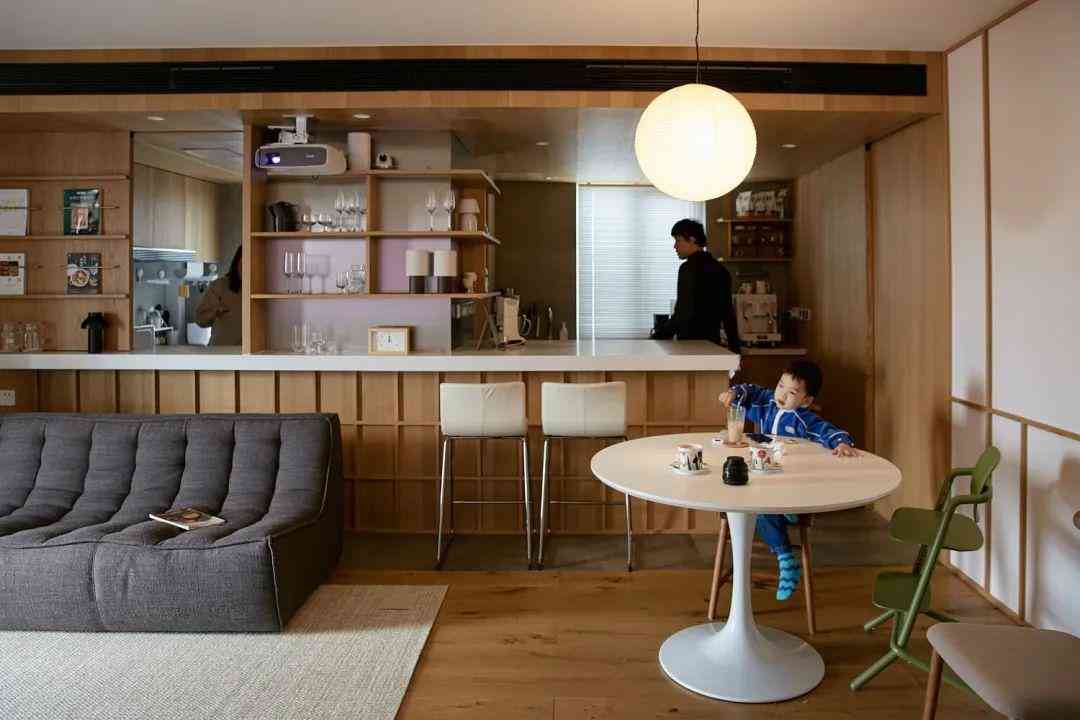 • 厨房开了一扇可以与客厅互动的“窗”,随时与客厅家人互动,避免孤单,照顾孩子也更安心;
