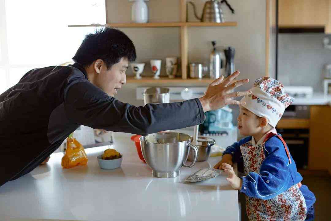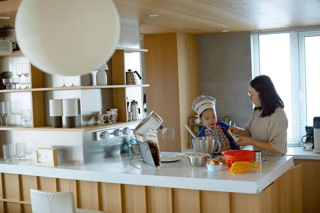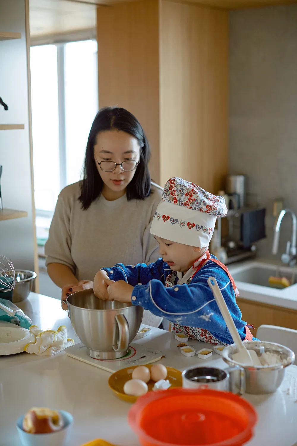 女主lulu热衷烘焙,岛台下方安装嵌入式烤箱,大饼戴上厨师帽,烘焙时帮妈妈搅拌、过筛、加料,还真像那么回事。