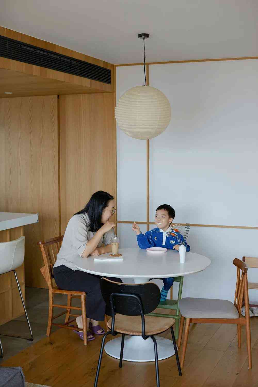 原本的餐厅被西厨和岛台“霸占”之后,无法放下大餐桌,放一张郁金香圆桌足够应对一家三口的一日三餐。